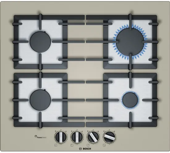 Особенности модели: Заводская настройка на газ (20 мбар), Индивидуальные чугунные решетки для всех конфорок, Функция FlameSelect