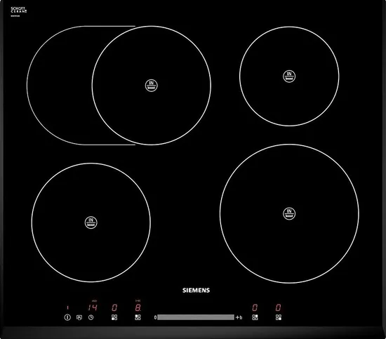 Индукционных зон нагрева : Индукционные конфорки: Индукционные конфорки варочных панелей Siemens имеют высокую мощность, они обеспечивают максимально быстрое закипание, отличаются высокой точностью регулировки нагрева. В процессе приготовления блюда сами конфорки остаются холодными, нагревается непосредственно дно специально предназначенной посуды.: 4