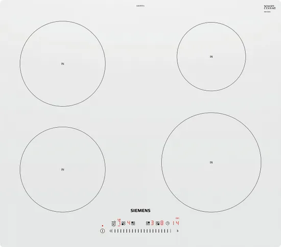 Индукционных зон нагрева : Индукционные конфорки: Индукционные конфорки варочных панелей Siemens имеют высокую мощность, они обеспечивают максимально быстрое закипание, отличаются высокой точностью регулировки нагрева. В процессе приготовления блюда сами конфорки остаются холодными, нагревается непосредственно дно специально предназначенной посуды.: 4